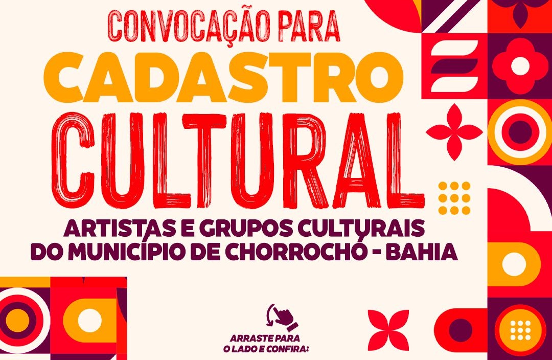 A Secretaria Municipal de Cultura de Chorrochó convoca todos os artistas, grupos culturais, músicos, dançarinos, artesãos, poetas, atores e demais fazedores de cultura do município para realizarem seu Cadastro Cultural. O objetivo desse levantamento é mapear fazedores e manifestações culturais no Município, facilitando a organização de ações estratégicas para o fomento do setor cultural em diversas áreas e, principalmente, a distribuição dos recursos da Lei Aldir Blanc no município. Visando, assim, fortalecer a cultura local e beneficiar aqueles que mantêm viva a tradição, a criatividade e a diversidade cultural da nossa terra. O cadastro pode ser realizado de forma presencial ou através do link abaixo. Participe e ajude a fortalecer a cultura em nosso Município Chorrochoense.