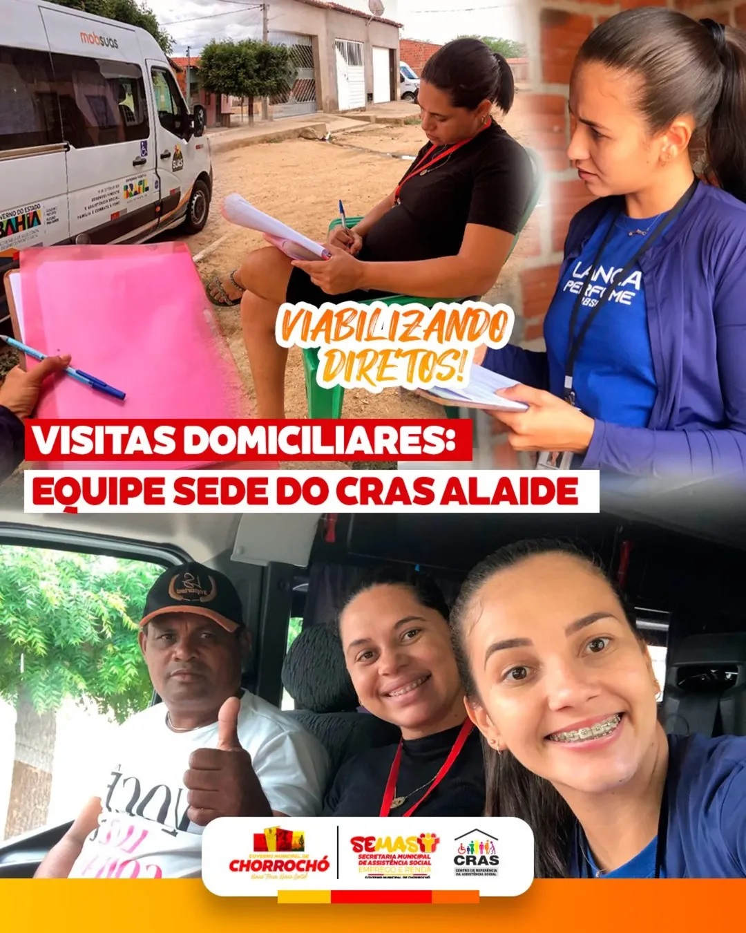 A Prefeitura Municipal de Chorrochó através da Secretaria Municipal de Assistência Social por meio da equipe do CRAS realizou nesta terça-feira(13/05) uma visita em campo fazendo visitas domiciliares com o objetivo de ouvir, orientar e garantir o acesso das famílias aos serviços socioassistenciais. Cada visita é uma oportunidade de fortalecer vínculos, identificar necessidades e promover os direitos de quem mais precisa. Seguimos firmes na missão de cuidar com respeito, empatia e responsabilidade social.
