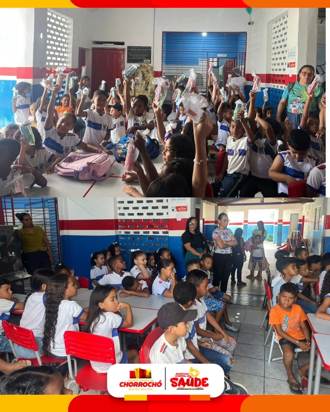A Prefeitura Municipal de Chorrochó, por meio da Secretaria de Municipal Saúde, realizou, na Escola Municipal Josefa Alventina de Menezes, uma ação do Programa Saúde na Escola (PSE) com duas atividades educativas voltadas para a promoção da saúde das crianças. A primeira, conduzida pela enfermeira Flávia, abordou o tema “O Semáforo do Corpo”, uma ferramenta pedagógica que auxilia as crianças a reconhecerem situações seguras, de risco ou de perigo em relação ao próprio corpo e ao contato com outras pessoas. A segunda atividade consistiu em uma palestra sobre saúde bucal, destacando a importância da escovação correta, do uso do fio dental e dos cuidados preventivos para manter dentes e gengivas saudáveis. Houve espaço para perguntas, interação dos alunos e orientações práticas com manequim macromodelo, favorecendo a sensibilização sobre a adoção de hábitos saudáveis desde a infância. Ao final, foram entregues kits de higiene oral, contendo escova dental e creme dental com flúor, como forma de incentivo à prática diária da escovação. No total, 04 turmas participaram da ação, somando 60 alunos, todos acompanhados por suas professoras responsáveis. A iniciativa buscou fortalecer a autonomia, o cuidado e a proteção das crianças, além de reforçar a importância do diálogo com pais, professores e profissionais de saúde.