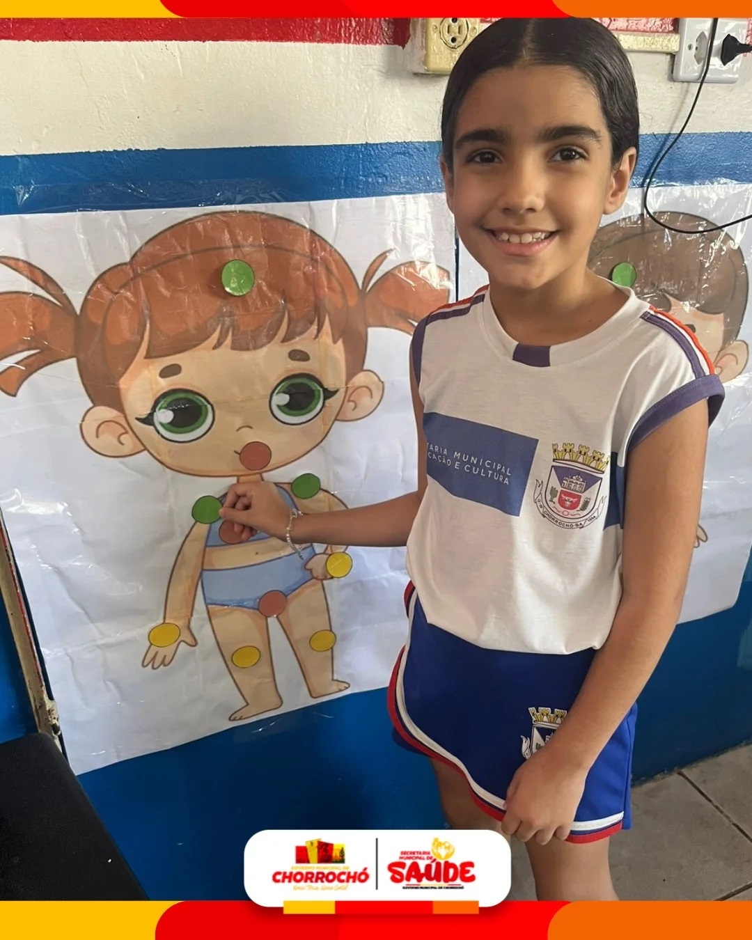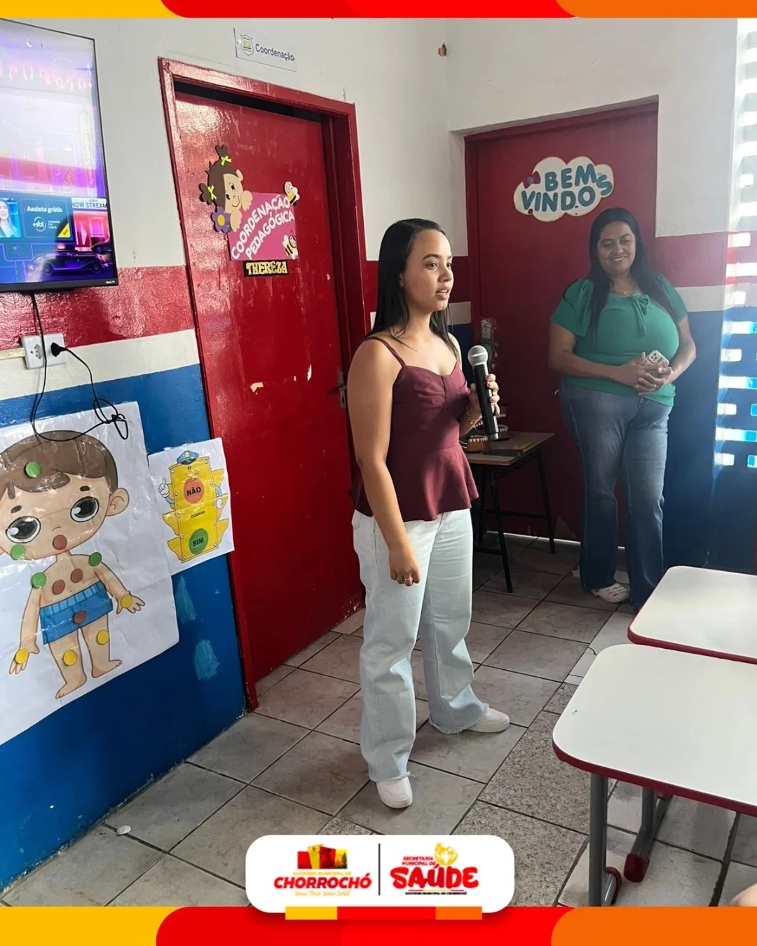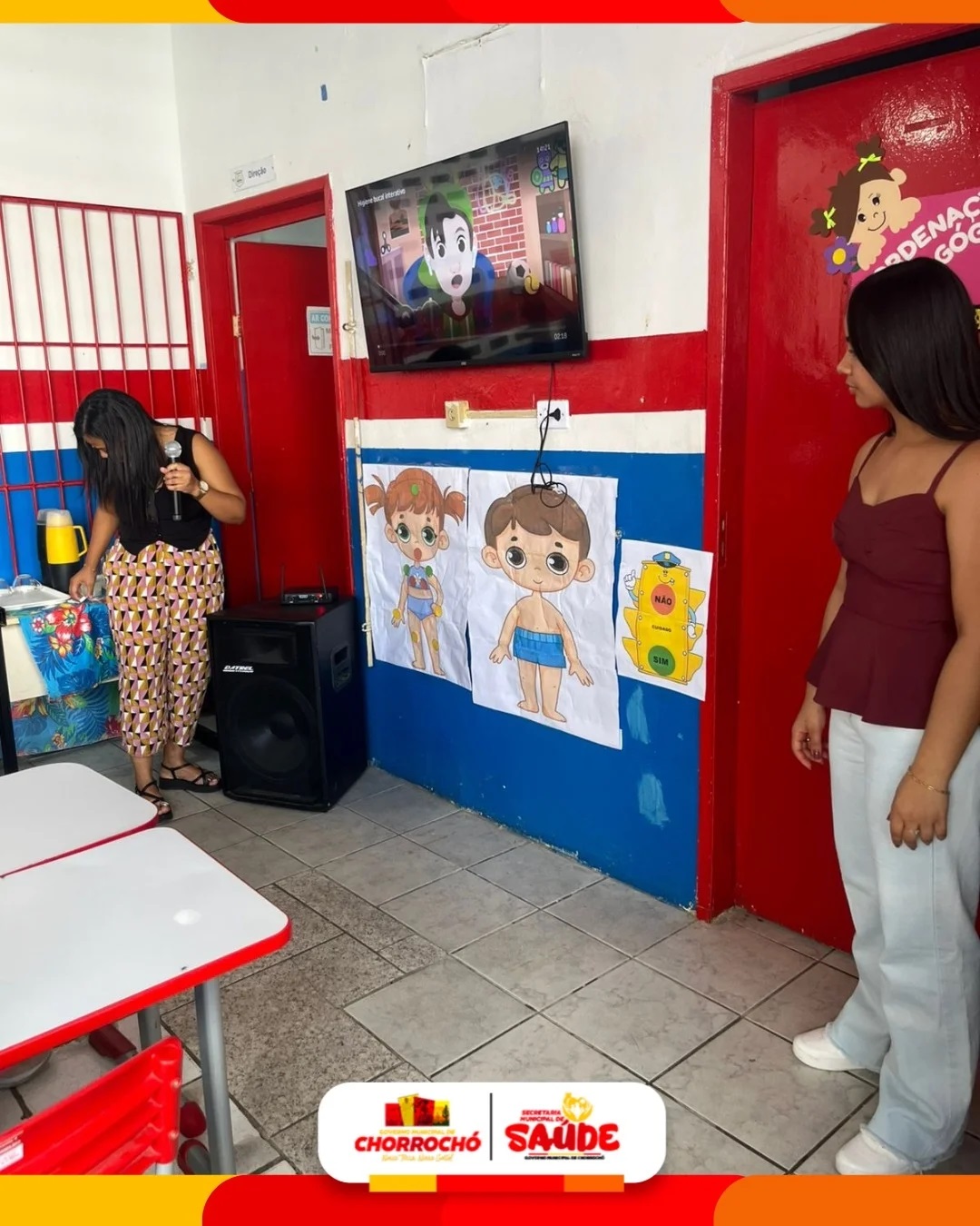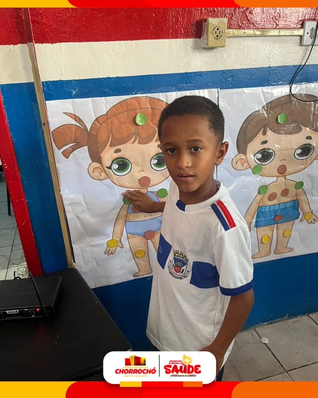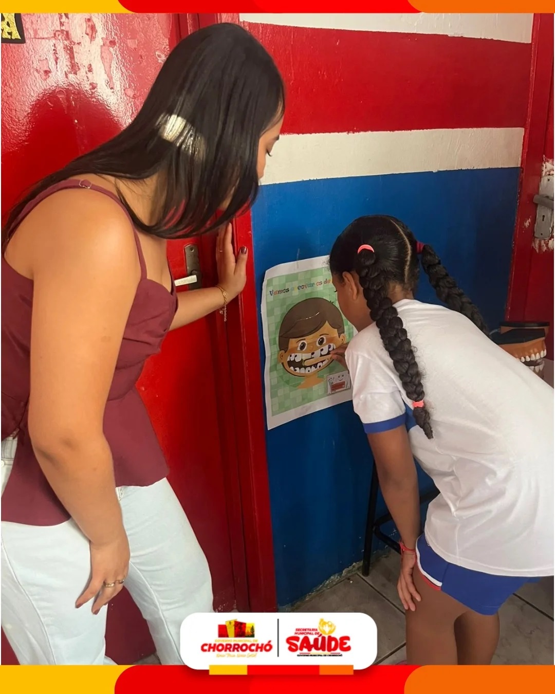 A Prefeitura Municipal de Chorrochó, por meio da Secretaria de Municipal Saúde, realizou, na Escola Municipal Josefa Alventina de Menezes, uma ação do Programa Saúde na Escola (PSE) com duas atividades educativas voltadas para a promoção da saúde das crianças. A primeira, conduzida pela enfermeira Flávia, abordou o tema “O Semáforo do Corpo”, uma ferramenta pedagógica que auxilia as crianças a reconhecerem situações seguras, de risco ou de perigo em relação ao próprio corpo e ao contato com outras pessoas. A segunda atividade consistiu em uma palestra sobre saúde bucal, destacando a importância da escovação correta, do uso do fio dental e dos cuidados preventivos para manter dentes e gengivas saudáveis. Houve espaço para perguntas, interação dos alunos e orientações práticas com manequim macromodelo, favorecendo a sensibilização sobre a adoção de hábitos saudáveis desde a infância. Ao final, foram entregues kits de higiene oral, contendo escova dental e creme dental com flúor, como forma de incentivo à prática diária da escovação. No total, 04 turmas participaram da ação, somando 60 alunos, todos acompanhados por suas professoras responsáveis. A iniciativa buscou fortalecer a autonomia, o cuidado e a proteção das crianças, além de reforçar a importância do diálogo com pais, professores e profissionais de saúde.