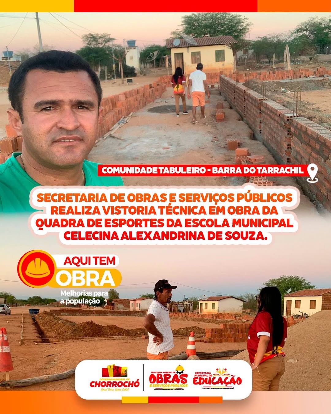 A Prefeitura Municipal de Chorrochó através da Secretaria Municipal de Obras e Serviços Públicos realizou vistoria técnica em obra da Quadra de Esportes da Escola Municipal Celecina Alexandrina de Souza, localizada na Comunidade Tabuleiro – Distrito Barra do Tarrachil-Chorrochó-BA.Se fizeram presentes Carol de Chefinho Engenheira Civil do Município, Darlan de Sertão Secretário de Obras e Serviços Públicos e funcionários da empresa responsáveis pela execução da obra.