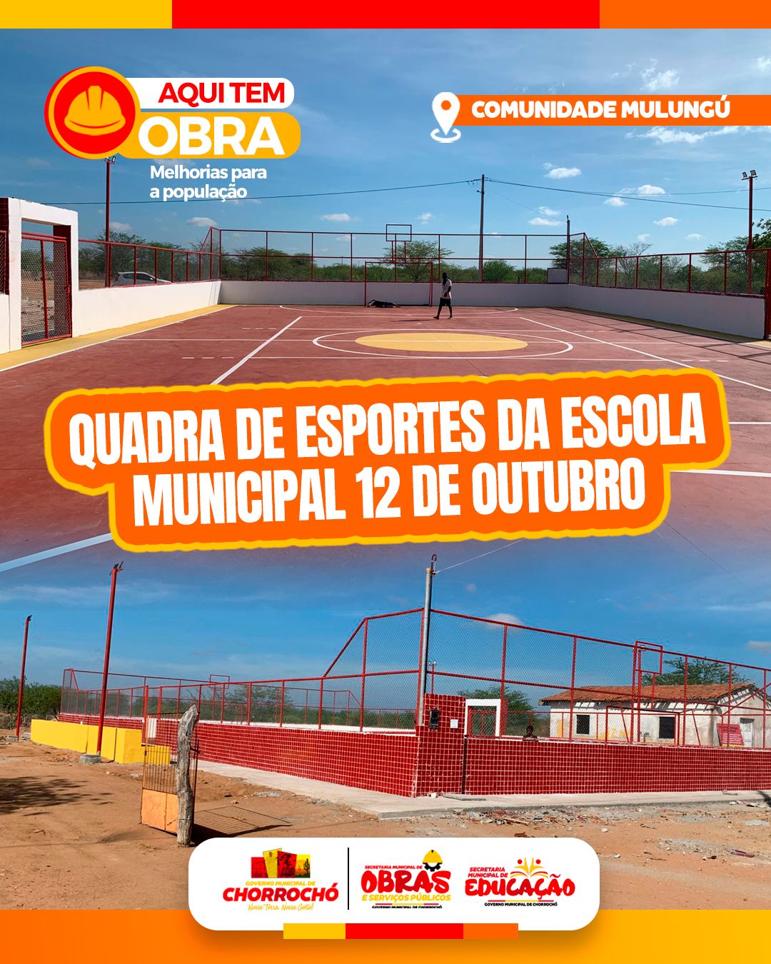 A Comunidade do Mulungu vive um momento histórico! Será inaugurada a quadra poliesportiva da Escola 12 de Outubro, um espaço moderno e seguro, pensado para incentivar a prática esportiva, o lazer e a integração entre estudantes e moradores de todas as idades.“A obra, tão aguardada pela comunidade, representa a realização de um sonho coletivo, fruto do compromisso da gestão municipal com o bem-estar e o desenvolvimento das comunidades. Agora os estudantes,crianças, jovens e adultos terão um local adequado para praticar esportes como futsal, vôlei e basquete, além de sediar eventos culturais e escolares. Famílias inteiras celebraram a conquista, que simboliza mais do que uma estrutura física é um espaço de convivência, saúde e alegria, que vai fortalecer os laços comunitários e inspirar novas gerações de atletas.” Ressalta Darlan de Sertão Secretário Municipal de Obras e Serviços Públicos.Governo itinerante leva ações e serviços a Zona Rural do nosso Município Chorrochoense.É o Governo Dilan Oliveira Compromisso e Trabalho, fazendo a prefeitura sempre presente!