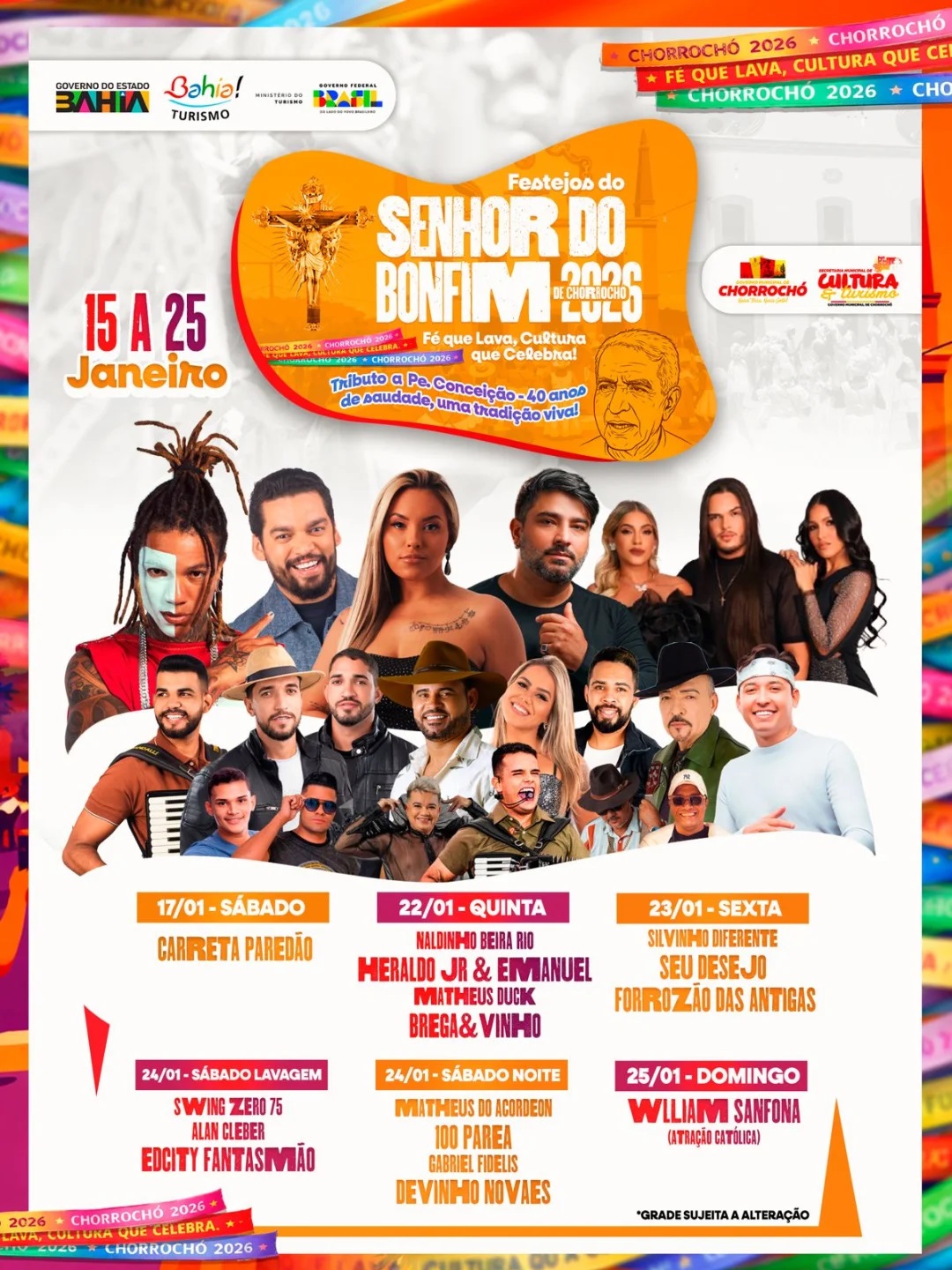Agora é oficial! A Prefeitura Municipal de Chorrochó divulgou a tão aguardada programação festiva da tradicional Festa do Senhor do Bonfim, que acontece entre os dias 15 a 25 de janeiro de 2026. A Fé que constrói a nossa história também preserva a memória de quem fez dela um legado,neste ano homenageia Padre Conceição, 40 anos após sua partida, sacerdote que deu origem à tradicional Lavagem do Bonfim, expressão viva de devoção e amor ao povo,o evento promete reunir fé, cultura e muita diversão para a população local e visitantes.