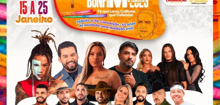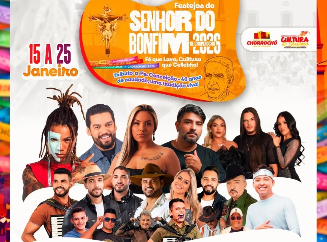 Agora é oficial! A Prefeitura Municipal de Chorrochó divulgou a tão aguardada programação festiva da tradicional Festa do Senhor do Bonfim, que acontece entre os dias 15 a 25 de janeiro de 2026. A Fé que constrói a nossa história também preserva a memória de quem fez dela um legado,neste ano homenageia Padre Conceição, 40 anos após sua partida, sacerdote que deu origem à tradicional Lavagem do Bonfim, expressão viva de devoção e amor ao povo,o evento promete reunir fé, cultura e muita diversão para a população local e visitantes.