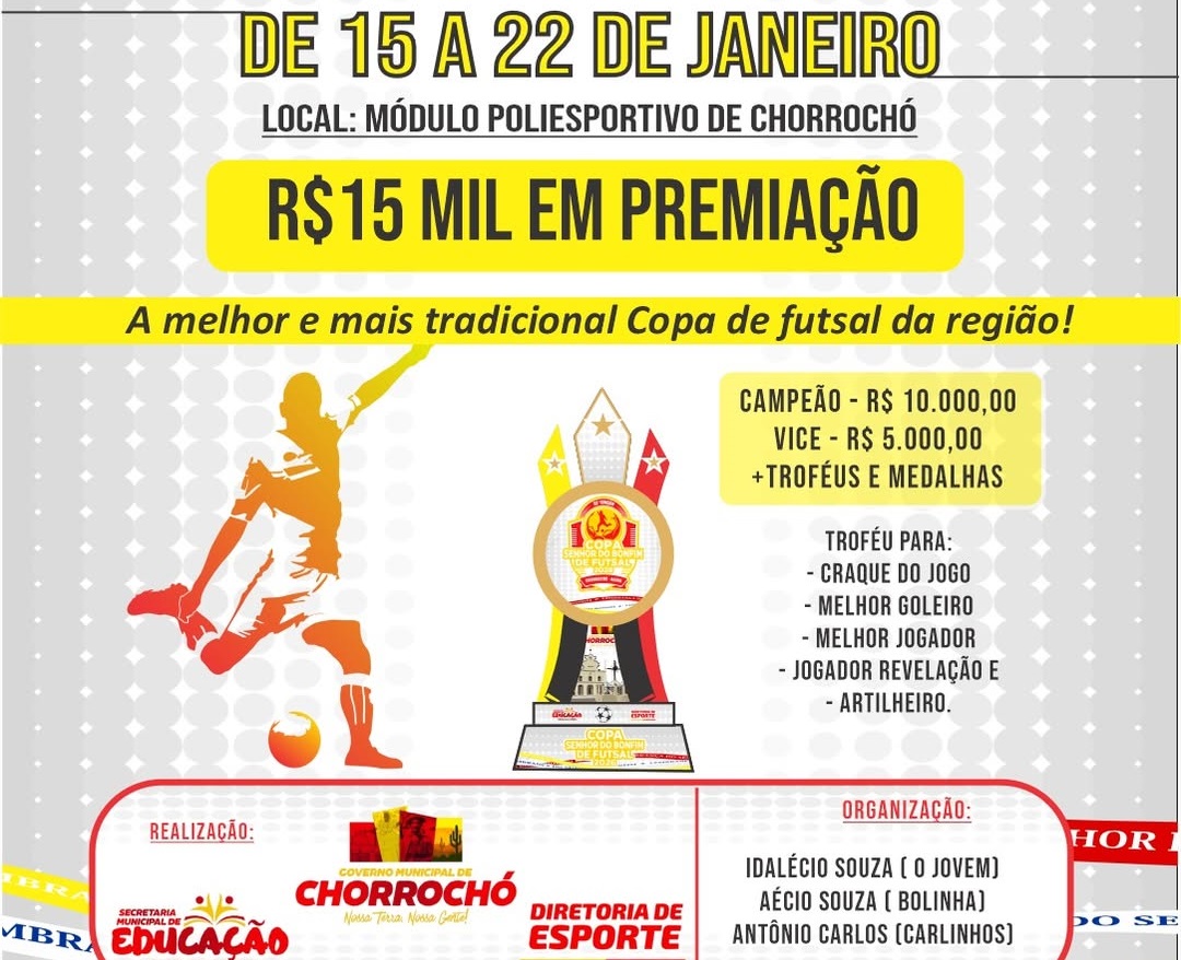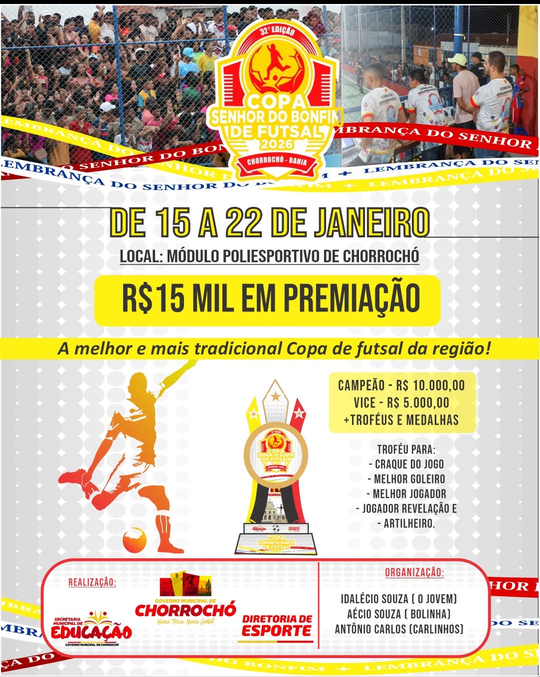 Está chegando uma das competições mais esperadas do ano na cidade de Chorrochó.A 32ª Copa Senhor do Bonfim de Futsal.Promovida pela Prefeitura Municipal de Chorrochó, por meio da Secretaria Municipal de Educação e Diretoria de Esportes e Lazer, a competição vem com uma nova premiação,conteúdos especiais e uma estrutura que promete agitar o esporte local e reunir atletas, torcedores e famílias em uma grande celebração.O torneio chega a mais uma edição consolidado como um dos principais eventos da modalidade na Região.De 15 a 22 de janeiro, Chorrochó será novamente palco da competição mais tradicional do futsal da região, reunindo atletas, torcidas e muita emoção no Módulo Poliesportivo de Chorrochó.
