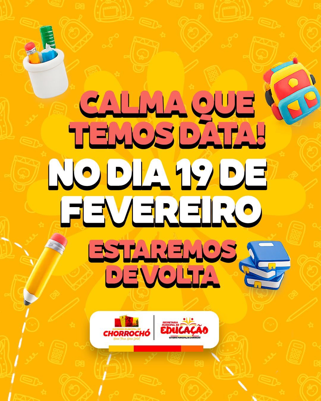 A volta às aulas 2026 na rede pública municipal de ensino acontece no dia 19 de fevereiro, marcando o reencontro de alunos, professores e equipes escolares.Nossas escolas estarão de portas abertas para receber nossos estudantes com muito carinho, aprendizado e novas conquistas! Um novo ano letivo começa com qualidade, salas climatizadas e tecnologia, além de profissionais preparados para receber cada aluno com cuidado, atenção e responsabilidade, em um ambiente seguro e acolhedor.