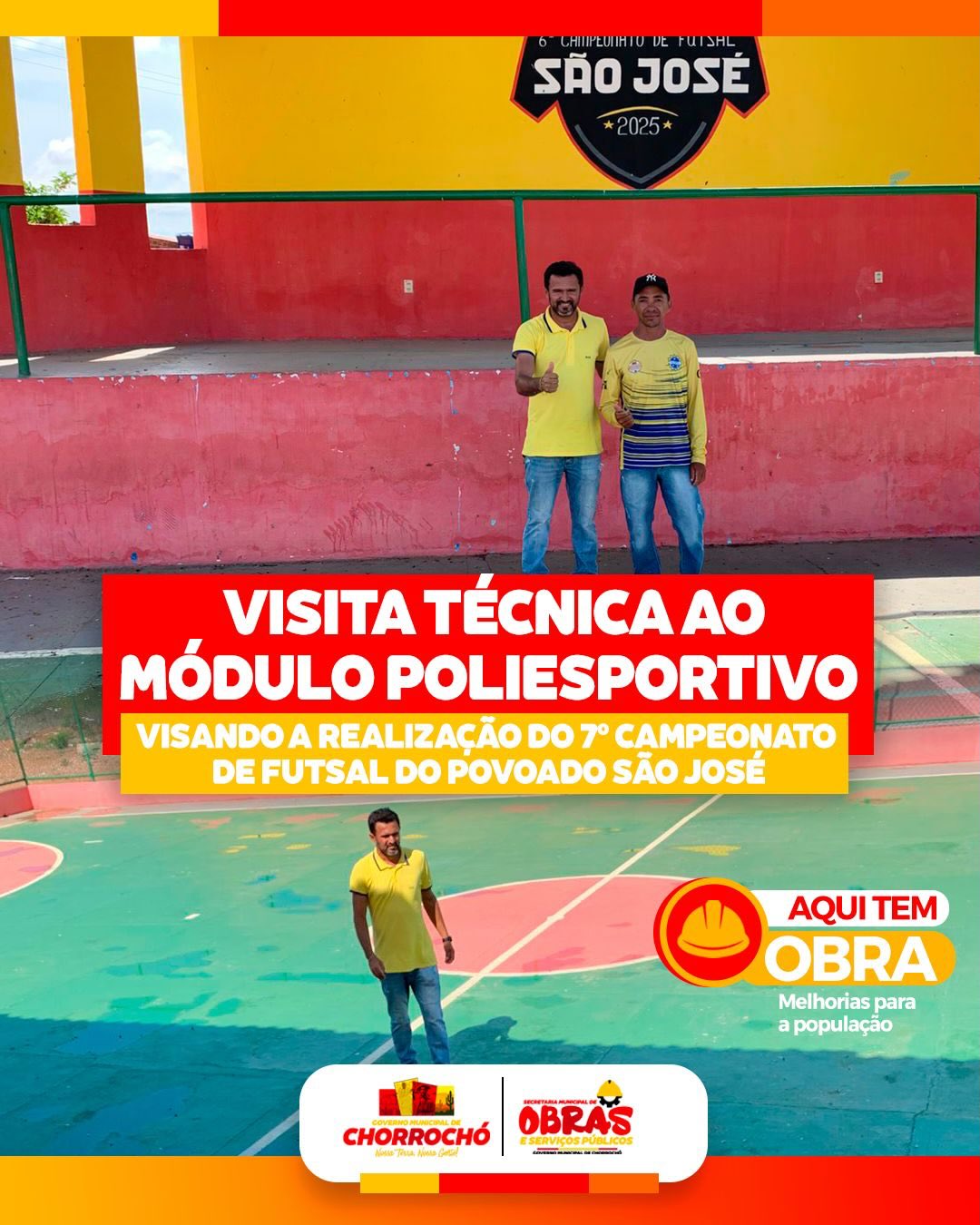 Na manhã desta segunda-feira (23/02/2026) a prefeitura municipal de Chorrochó por meio da secretaria municipal de obras e serviços públicos esteve realizando uma visita técnica ao módulo poliesportivo do povoado São José. “Segundo Darlan de Sertão (Secretario municipal de Obras e Serviços Públicos), o objetivo da visita é realizar uma avaliação estrutural e de segurança, verificando condições do piso, iluminação, vestiários e alambrados para realização do 7º Campeonato de Futsal do Povoado garantindo a segurança de atletas e público. Governo itinerante levando ações e serviços por todo município!