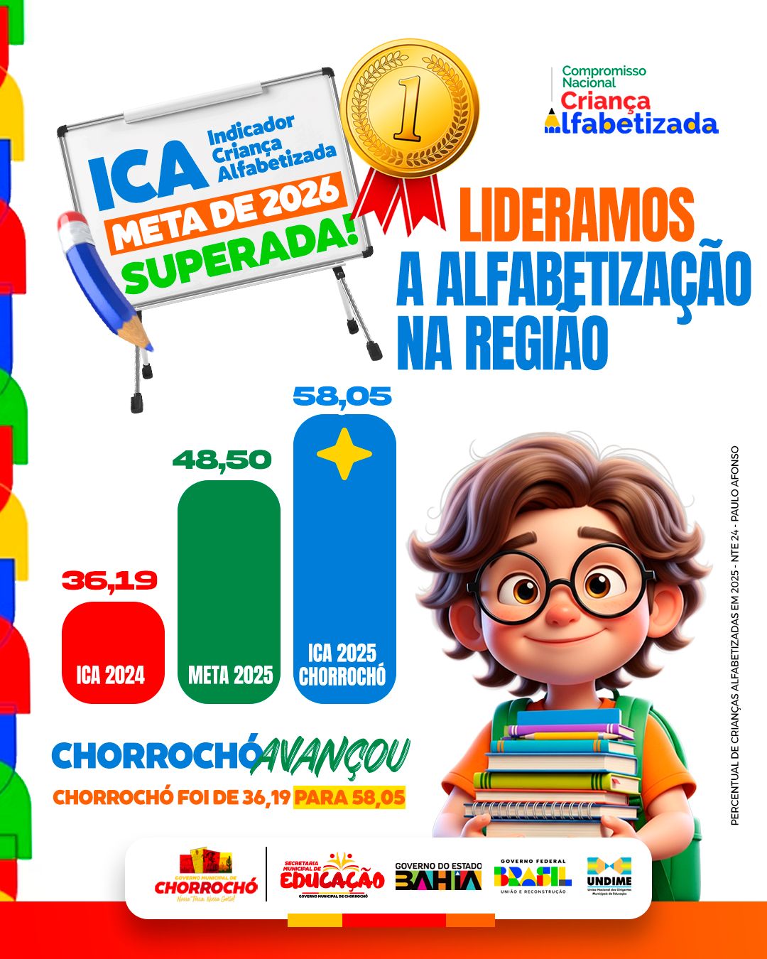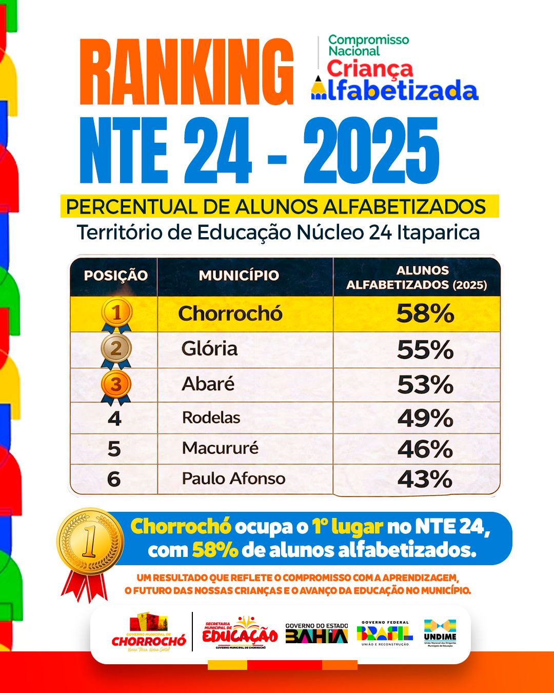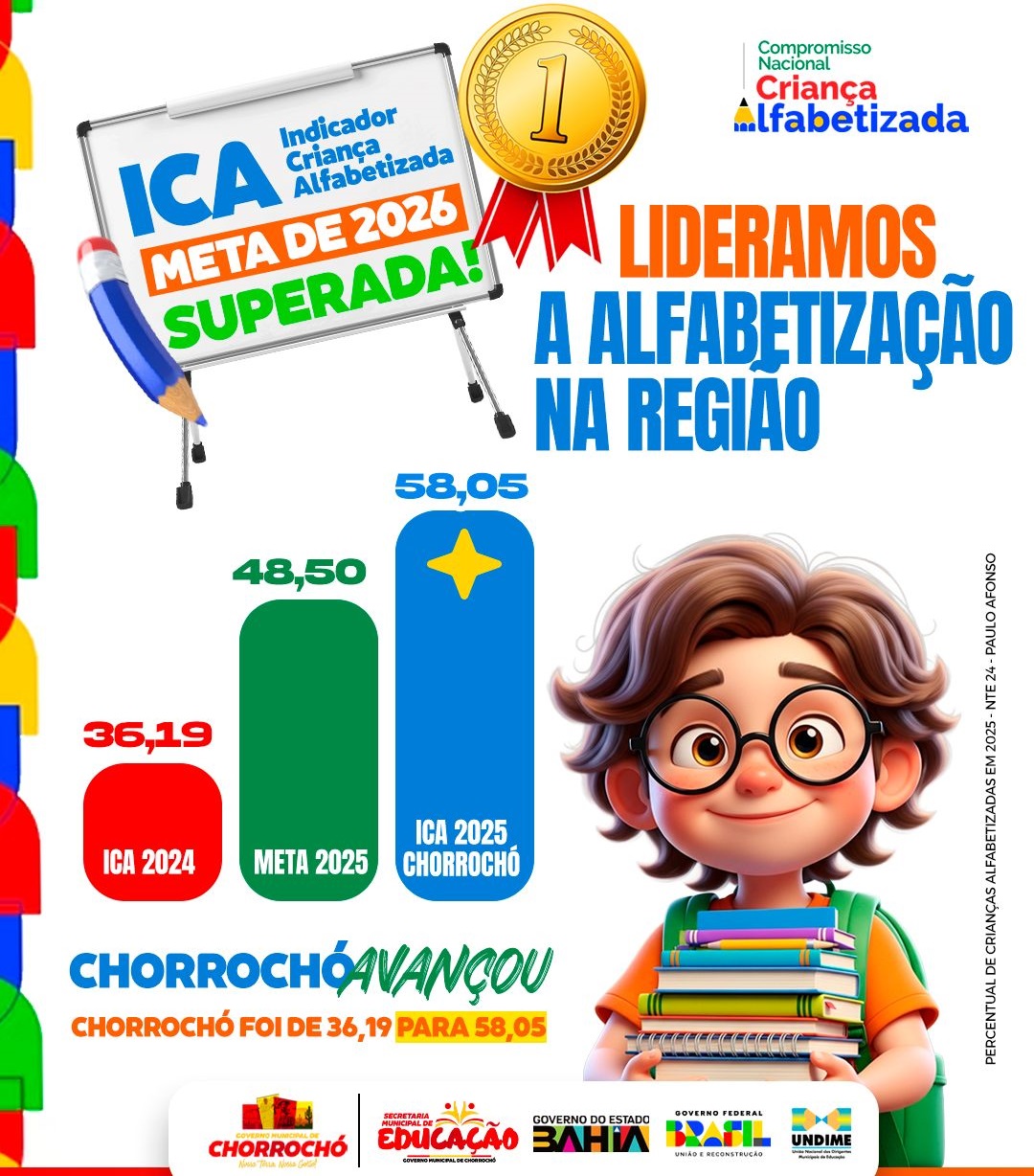 A Secretaria Municipal de Educação de Chorrochó celebra, com orgulho e gratidão, os resultados alcançados nos Índices de Crianças Alfabetizadas (ICA) 2025,divulgados pelo MEC/Inep.Com o índice de 58,05% de crianças alfabetizadas,superando as metas estabelecidas,reconhecemos que esse avanço é fruto do compromisso coletivo. Agradecemos, de forma especial, aos gestores, coordenadores, professores, famílias e a toda equipe de apoio, que, com dedicação, responsabilidade e parceria, tornam possível a construção de uma educação pública de qualidade. Este resultado é a prova de que, juntos, estamos no caminho certo, garantindo o direito à aprendizagem e a um futuro melhor para nossas crianças Chorrochoenses.