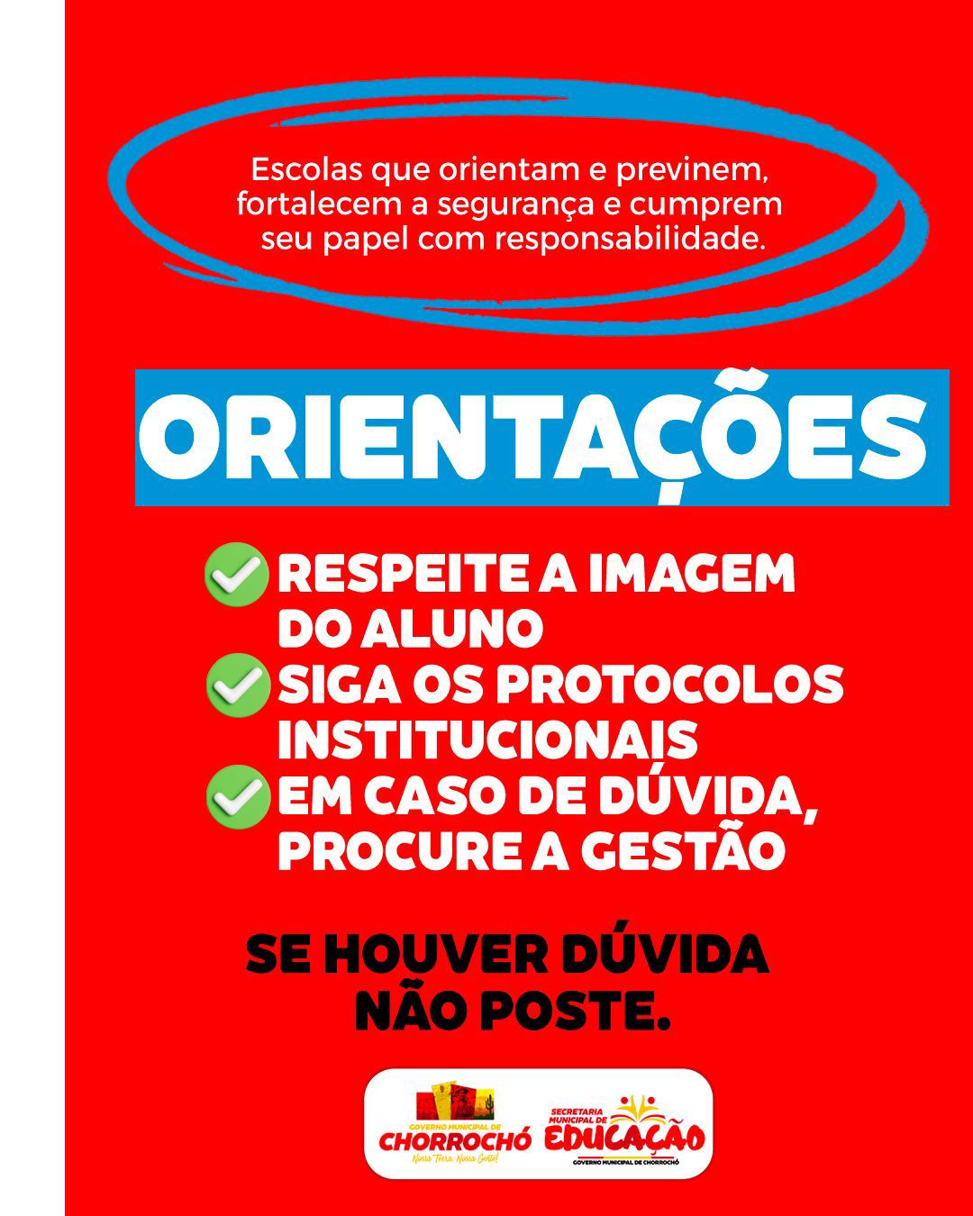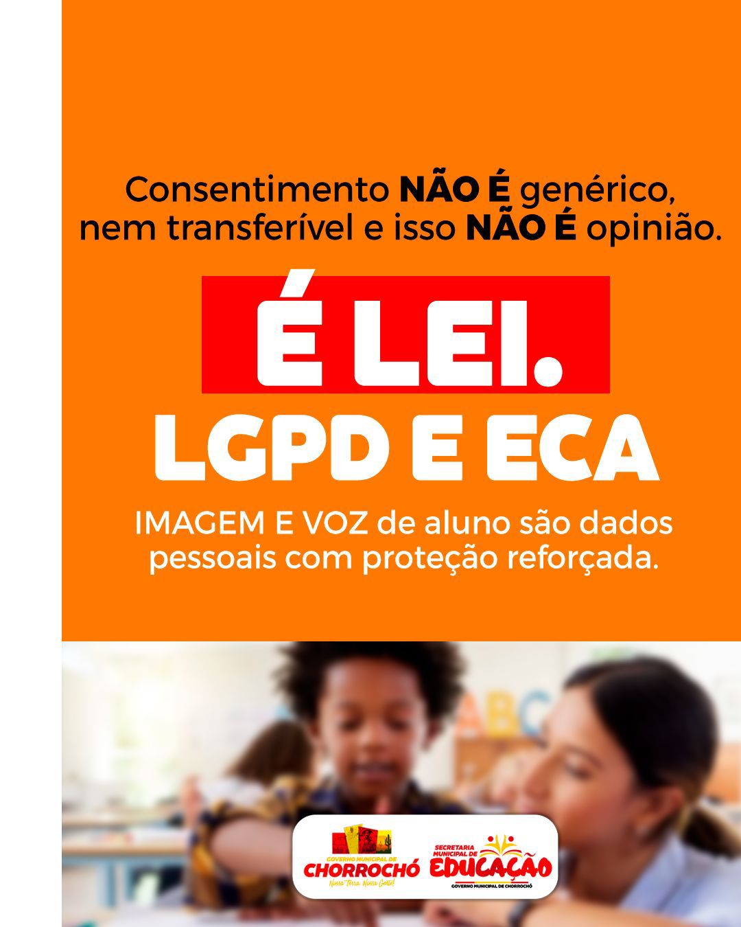 A Prefeitura Municipal de Chorrochó por meio da Secretaria Municipal de Educação segue comprometida com a proteção da infância, dentro e fora das redes. O novo ECA Digital e a Lei Geral de Proteção de Dados Pessoais (LGPD) já estão em vigor e trazem mudanças importantes, especialmente no que diz respeito à proteção de nossas crianças e adolescentes.A partir de agora, o uso de imagens de estudantes exige ainda mais responsabilidade:escolas,instituições e demais organizações só podem divulgar fotos ou vídeos mediante autorização formal e documentada dos responsáveis.Essa medida reforça a segurança, a privacidade e o respeito aos direitos das nossas crianças no ambiente digital.Essa medida garante mais segurança, privacidade e respeito aos direitos dos pequenos no ambiente digital e, seguimos comprometidos com a proteção da nossa infância, dentro e fora das redes.A proteção de dados está diretamente alinhada à missão institucional do órgão, de garantir educação básica com qualidade social, emancipadora e integral.O respeito à privacidade e aos direitos dos titulares fortalece a confiança da comunidade escolar e assegura que as ações educacionais sejam pautadas pela equidade, inclusão e democracia. Agradecemos a compreensão e a colaboração de todas as escolas nesse cuidado conjunto.