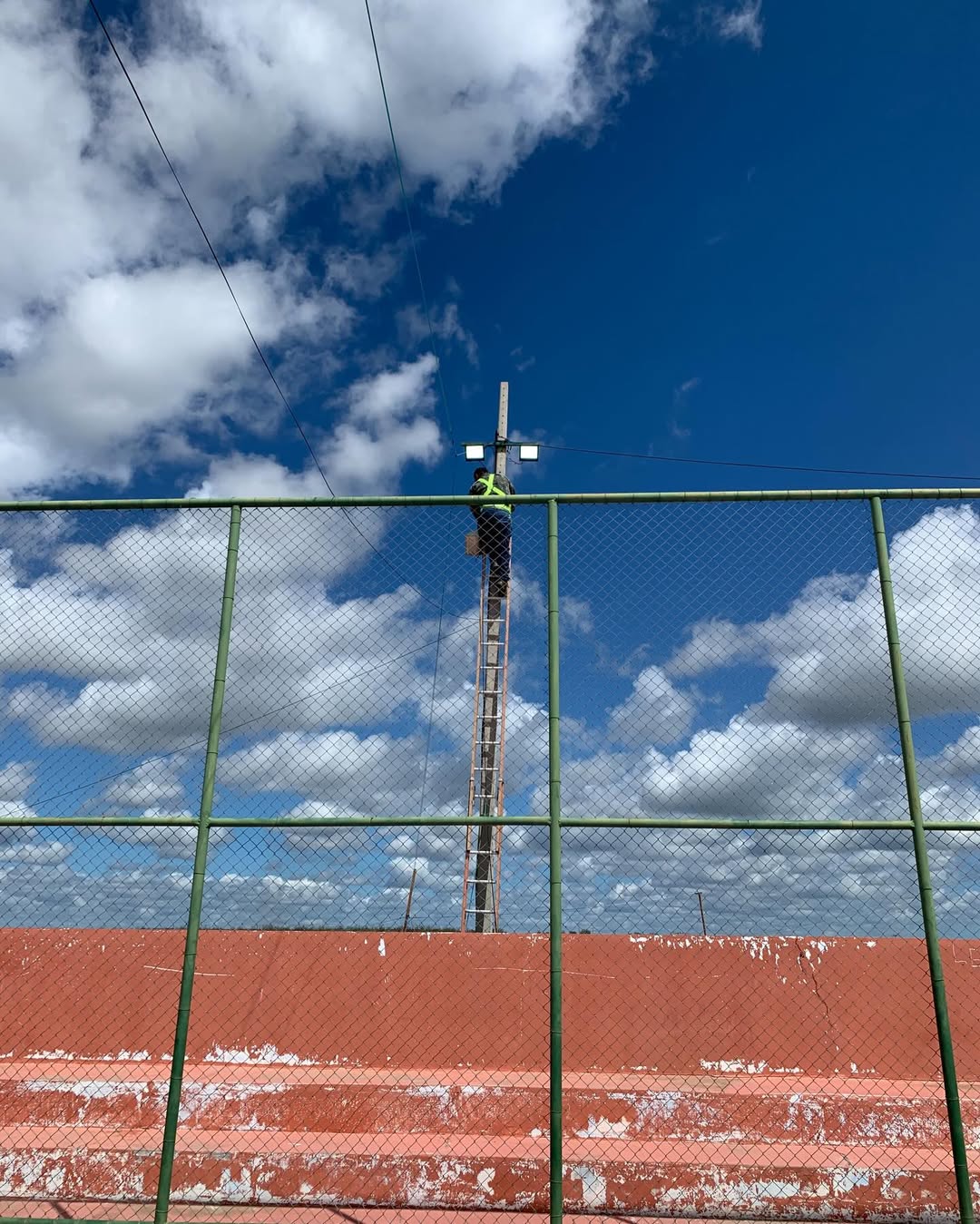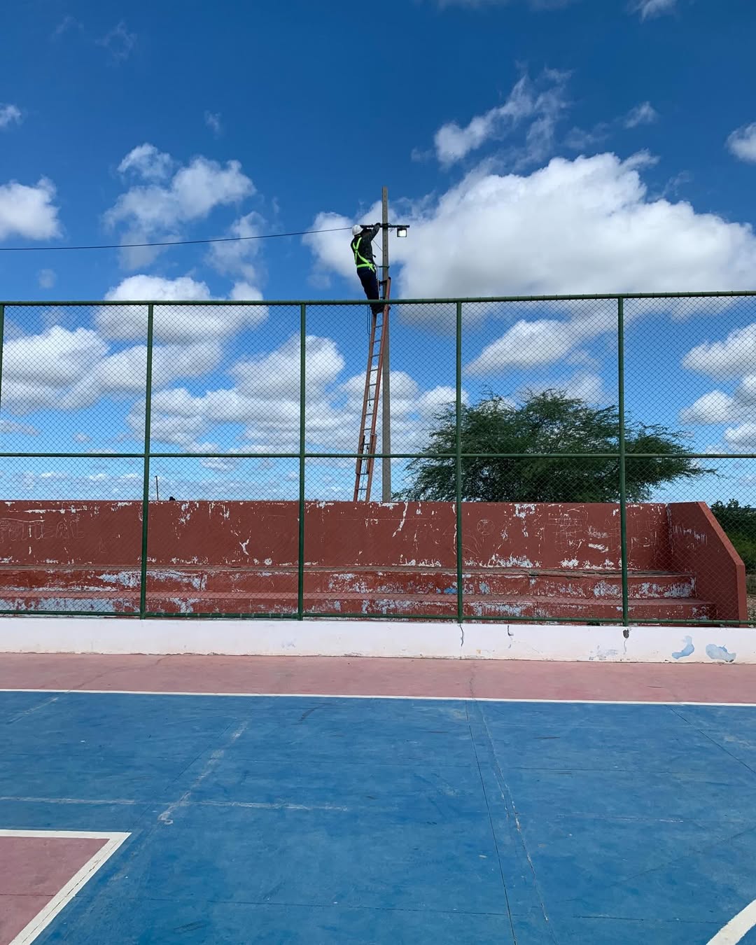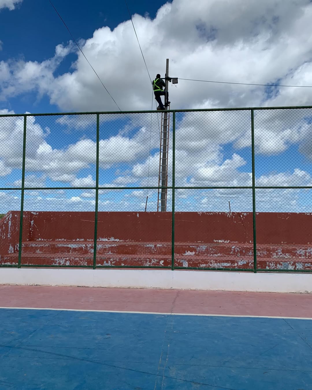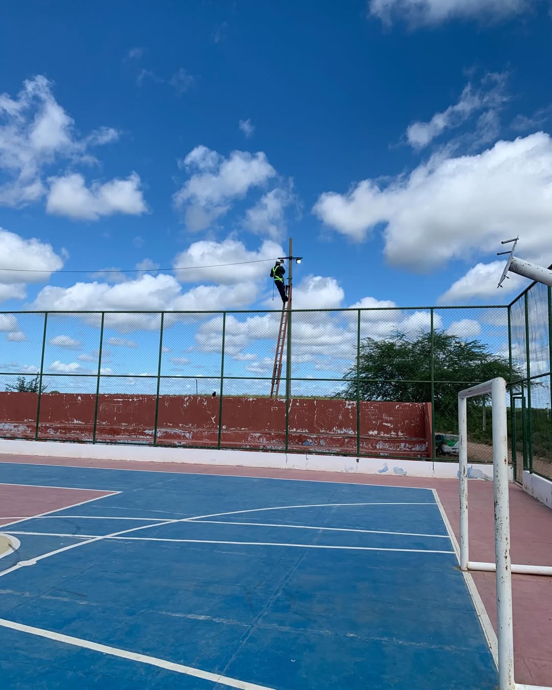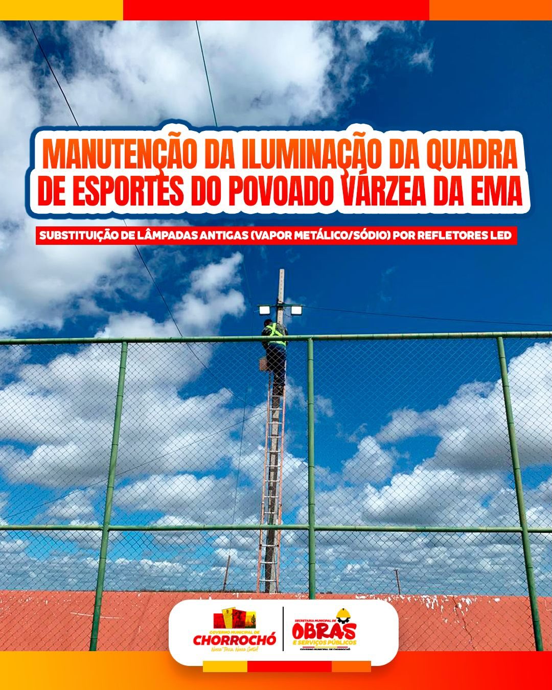 A Prefeitura Municipal de Chorrochó, por meio da secretaria Municipal de obras e serviços públicos esteve na manhã desta sexta-feira (10/04/2026), realizando a manutenção da iluminação pública com substituição de lâmpadas antigas (vapor metálico /sódio) por refletores LED no módulo poliesportivo do Povoado Várzea da Ema.O ambiente promete ficar ainda mais claro durante as próximas práticas noturnas a partir dos reparos realizados no sistema de iluminação do concorrido espaço esportivo. Governo itinerante levando ações e serviços por todo município!