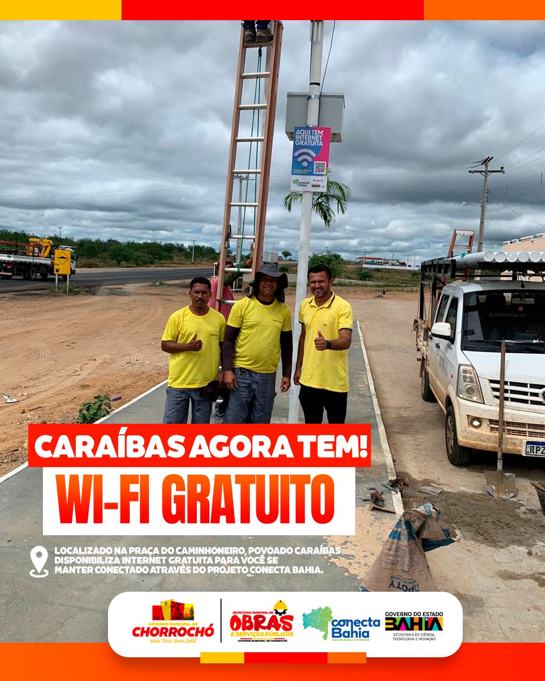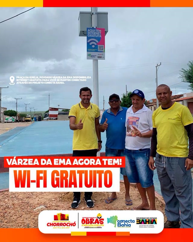 Na manhã desta segunda-feira (13/04/2026), a Prefeitura Municipal de Chorrochó, por meio da Secretaria Municipal de Obras e Serviços Públicos esteve acompanhando e fornecendo total suporte a equipe técnica do Projeto Conecta Bahia na instalação de pontos de internet Wi-Fi gratuita em praças nos Povoados Caraíbas (praça do caminhoneiro) e Varzea da Ema (praça da igreja).Oferecer conectividade ao cidadão é um dos principais objetivos do Projeto Conecta Bahia, que hoje passar a disponibilizar, sinal gratuito de internet na Praça do Caminhoneiro (Povoado de Caraíbas) e Praça da Igreja (Povoado de Várzea da Ema). “Segundo o Secretario Municipal de Obras e Serviços Públicos Darlan de Sertão, a iniciativa é resultado de um convênio firmado pela Prefeitura Municipal de Chorrochó com o Governo do Estado da Bahia, por meio da Secretaria de Ciência, Tecnologia e Inovação (Secti).O programa leva internet gratuita a praças e espaços públicos de diversos municípios baianos, ampliando o acesso da população ao ambiente digital.” Com a expansão do Conecta Bahia, Chorrochó avança em inclusão digital, facilitando comunicação, estudos, negócios e o uso de serviços públicos online, fortalecendo o desenvolvimento social e tecnológico da cidade.